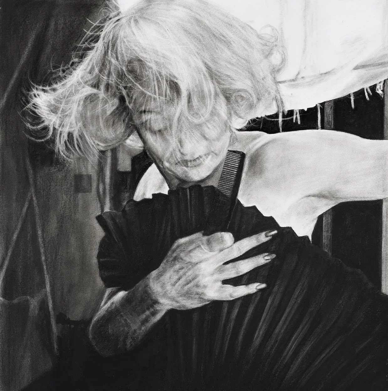 We decided to collaborate on these drawings. I chose two images of Dietrich which have remained with me for years as my favourites - perhaps because they show her in moments of unawareness. In one she strikes a paparazzi at the airport with her handbag in the other she grapples with a comb and dress in what I imagine is an effort to get ready for a performance.